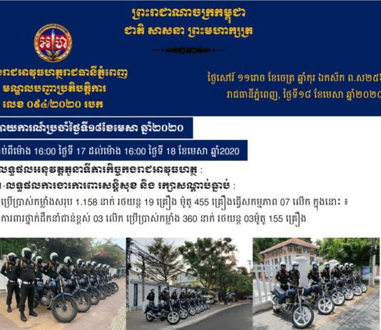 សកម្មភាពកម្លាំងកងរាជអាវុធហត្ថរាជធានីភ្នំពេញ ថ្ងៃសៅរ៍ទ ១១រោច ខែចេត្រ ឆ្នាំជូត ទោស័ក ព.ស២៥៦៣ ត្រូវនឹងថ្ងៃទី១៨ ខែមេសា ឆ្នាំ២០២០ !