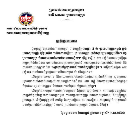ឧត្តមសេនីយ៍ឯក រ័ត្ន ស្រ៊ាង ចេញសេចក្តីថ្លែងការណ៍ថ្កោលទោសចំពោះជនក្បត់ជាតិ៣ជំនាន់ សម រង្ស៉ី