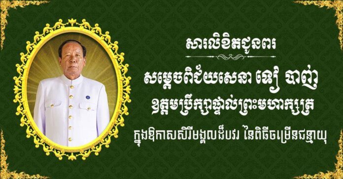 ជាថ្មីម្តងទៀត យើងខ្ញុំទាំងអស់គ្នា សូមឧទ្ទិសបួងសួងដល់គុណបុណ្យព្រះរតនត្រ័យ វត្ថុស័ក្តិសិទ្ធិក្នុងលោក និងទេវតារក្សាទឹកដី នៃព្រះរាជាណាចក្រកម្ពុជា តាមជួយបីបាច់ថែរក្សាប្រទានពរជ័យ សិរីសួស្តី ជ័យមង្គលគ្រប់ប្រការ ជូនចំពោះ សម្តេចពិជ័យសេនា និងលោកជំទាវ ព្រមទាំងបុត្រា បុត្រី ចៅប្រុស ចៅស្រី សូមមាន ជន្មាយុយឺនយូរ និងសុខភាពល្អបរិបូរណ៍ ដើម្បីរួមចំណែកដឹកនាំនាវាកម្ពុជា និងប្រជាពលរដ្ឋឆ្ពោះទៅកាន់វឌ្ឍនភាព ក្នុងសុខសន្តិភាពស្ថិរភាពដ៏រឹងមាំតរៀងទៅ៕